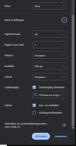 Hoe kan ik aangepast (kleur, enkelzijdig, etc.) afdrukken in Google Chrome op Windows?
